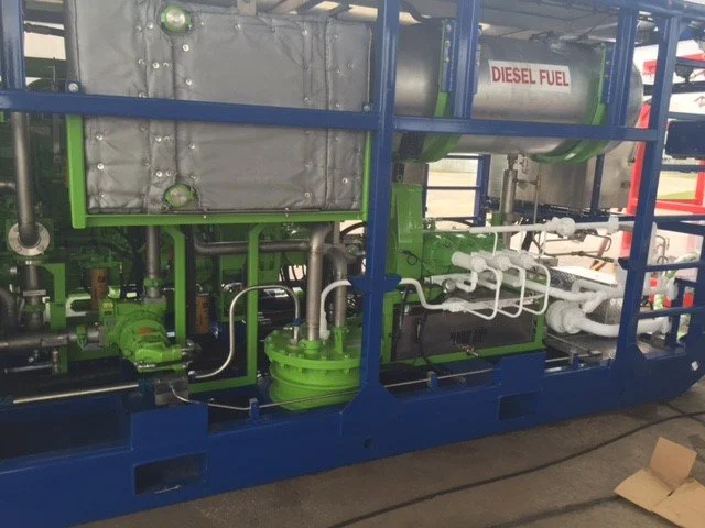 The Liquid Nitrogen Converter is a self-contained unit, assembled on a portable skid obtaining liquid nitrogen from an external storage tank and delivering gaseous nitrogen for external use. The system is capable of delivering 180K SCFH of nitrogen up to 10,000 PSI as gas at a temperature of approximately 70°F.